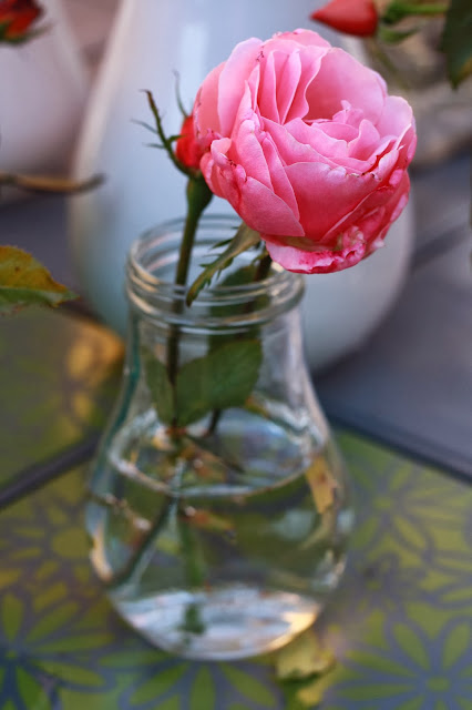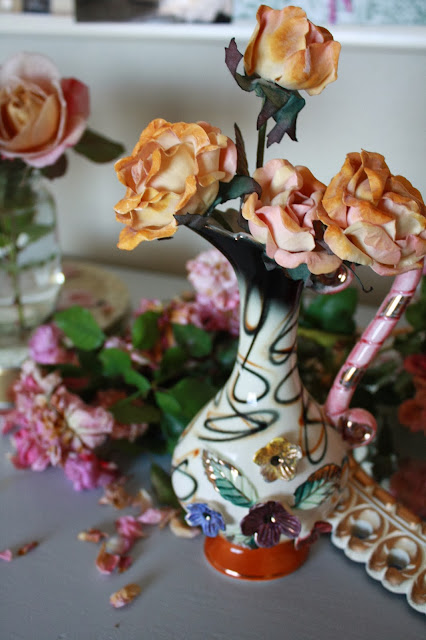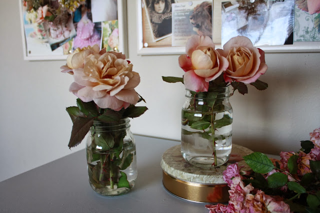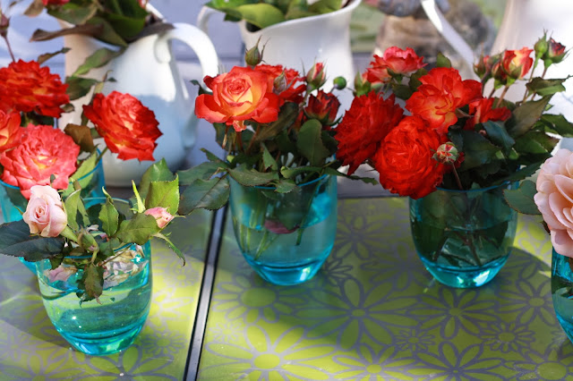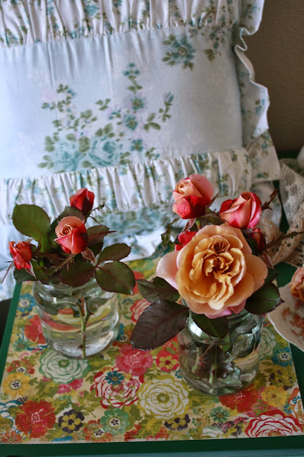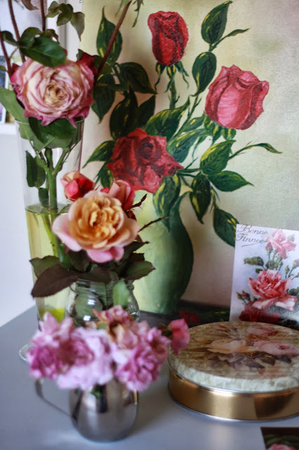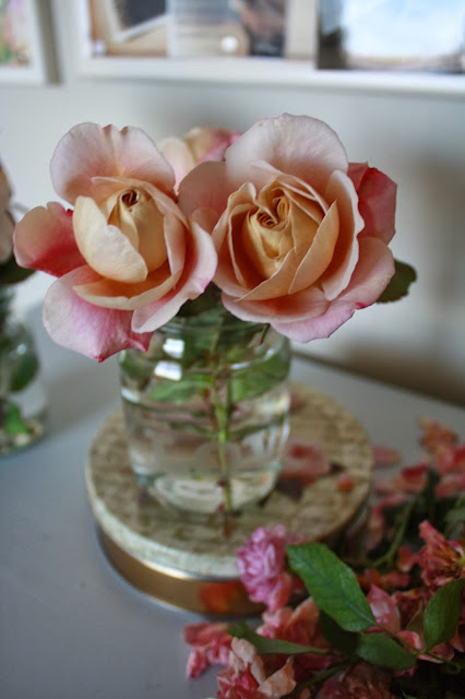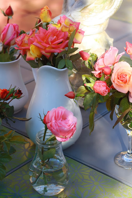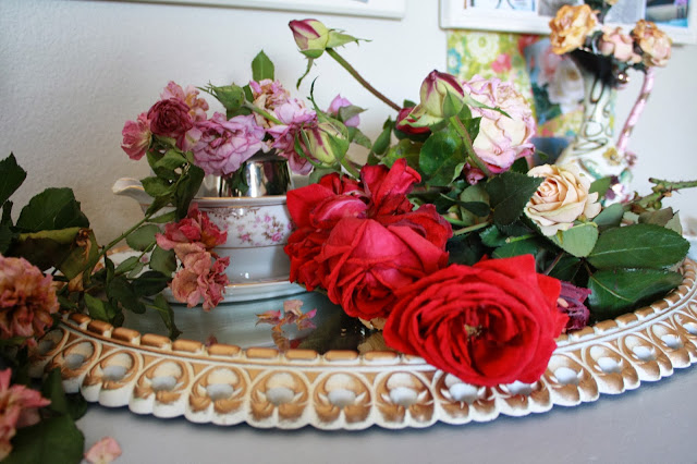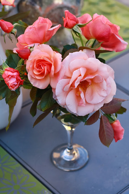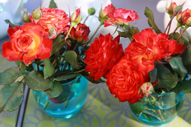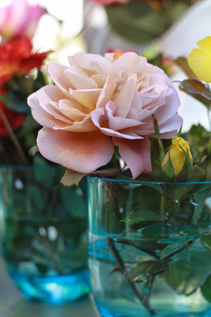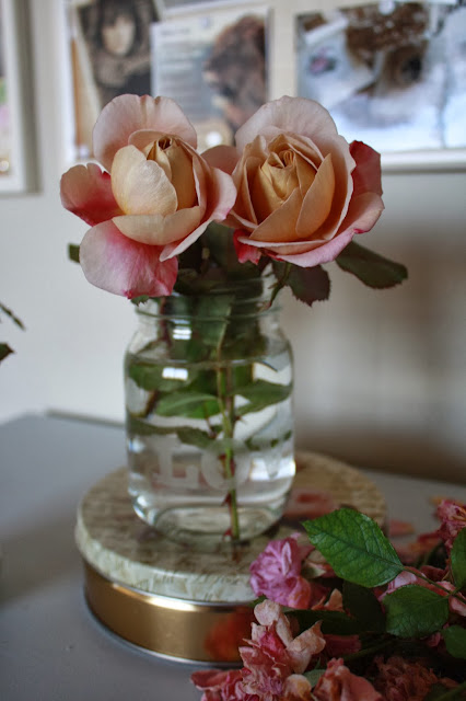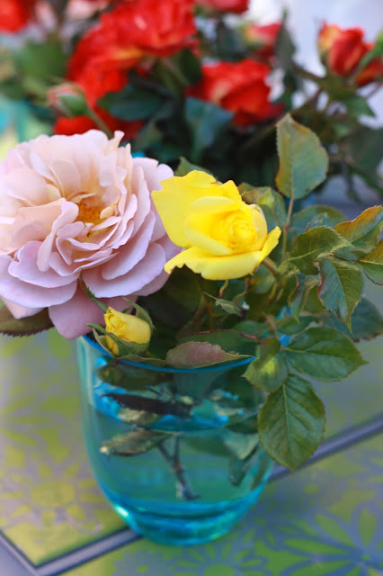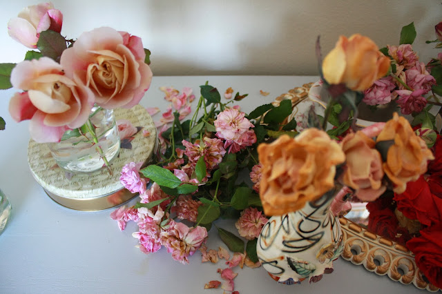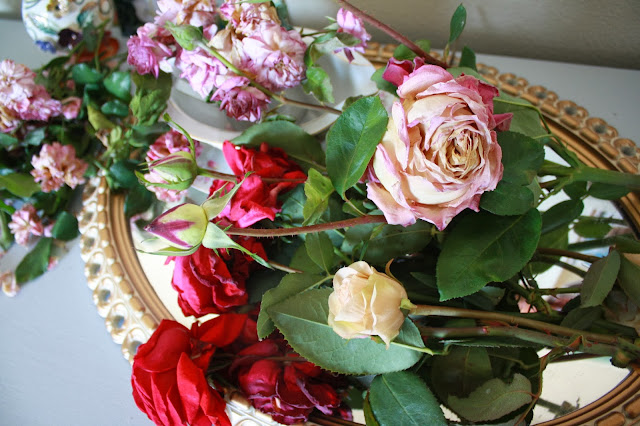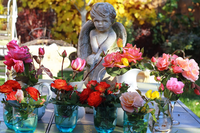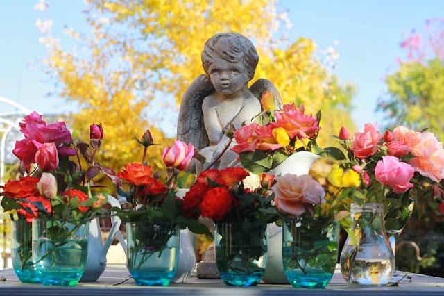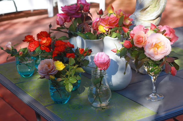 Fragrant Cloud roses, Unicorn roses, Distant Drums roses, Cinco de Mayo roses, Queen Elizabeth roses, Intrigue roses, Charisma, Sun Sprite, Chicago Peace... the profusion of roses in the garden during these last days of October was beyond magical and I dare say miraculous. It was almost hard to decide what to do with so many roses... and I should say that's not exactly the right thing to say, right? Who wouldn't want to have this many roses to collect? Roses are always welcome. But what to do with so many roses now that my house is practically in total chaos? Everything boxed up... boxes and boxes scattered around an almost emptied home...
