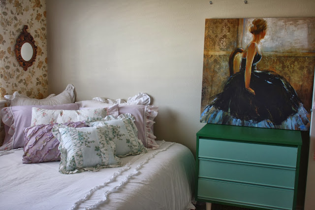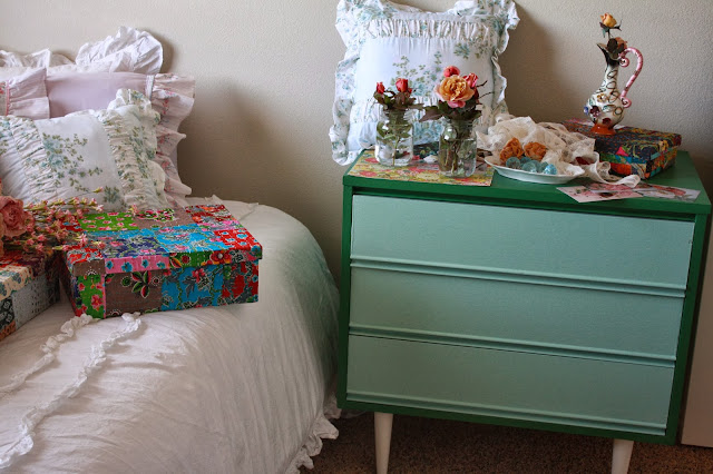 I'm talking about furniture painting, of course... And thus, I decided it was definitely time (again) to change the paint color on some of the furniture in my 'girly' room upstairs. I love pink... I do, but for some reason my heart is not into pink lately. Color infatuation comes and goes around here depending on moods and other fanciful dreams... and thus, I opted for green this time.